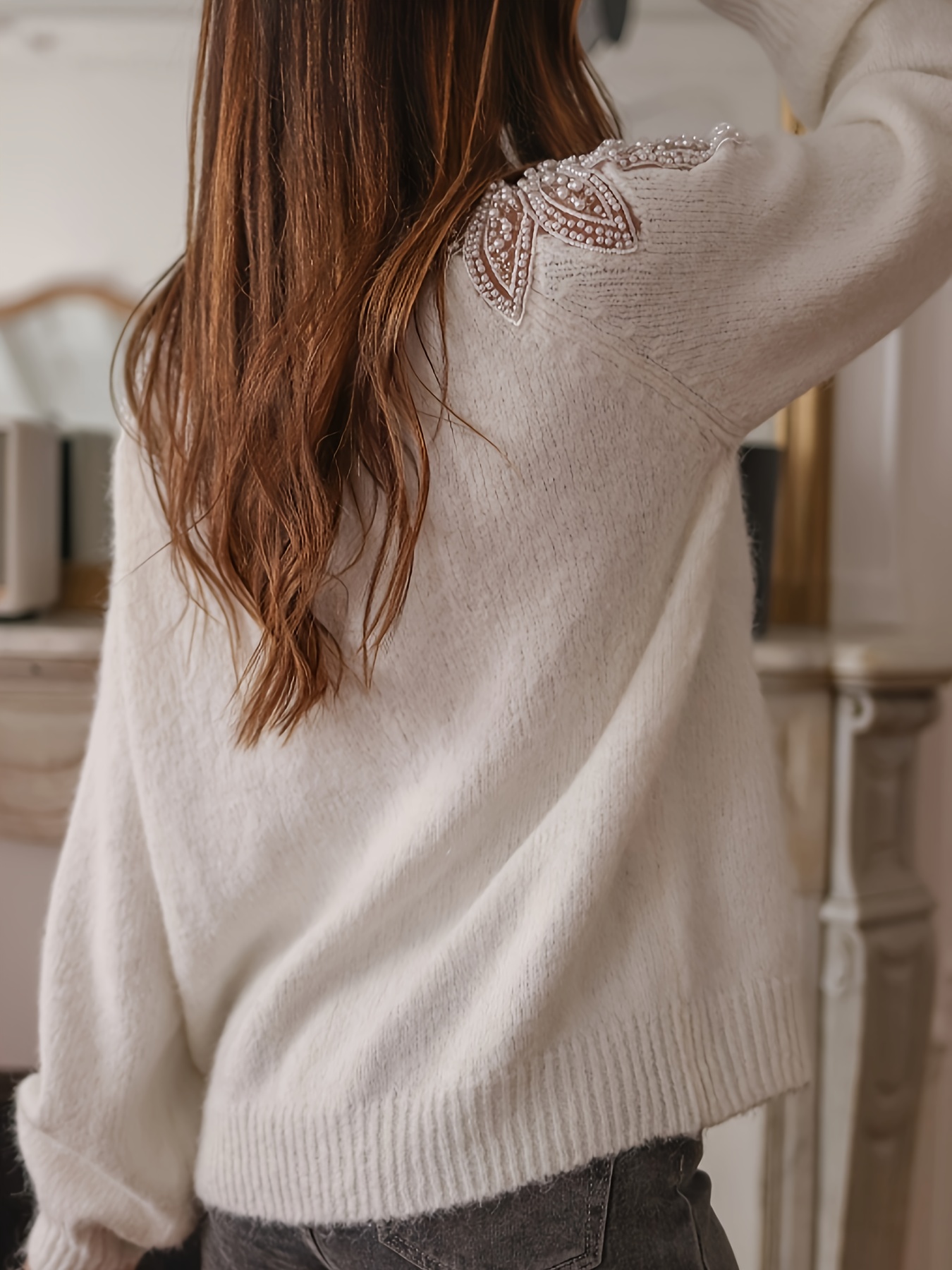 Women's Casual Chic Lace-Trimmed Long Sleeve Sweater with Bow Detail at Back - Soft Round Neck Pullover, Medium Stretch Autumn Winter Top for Casual Attire, Cute Sweaters