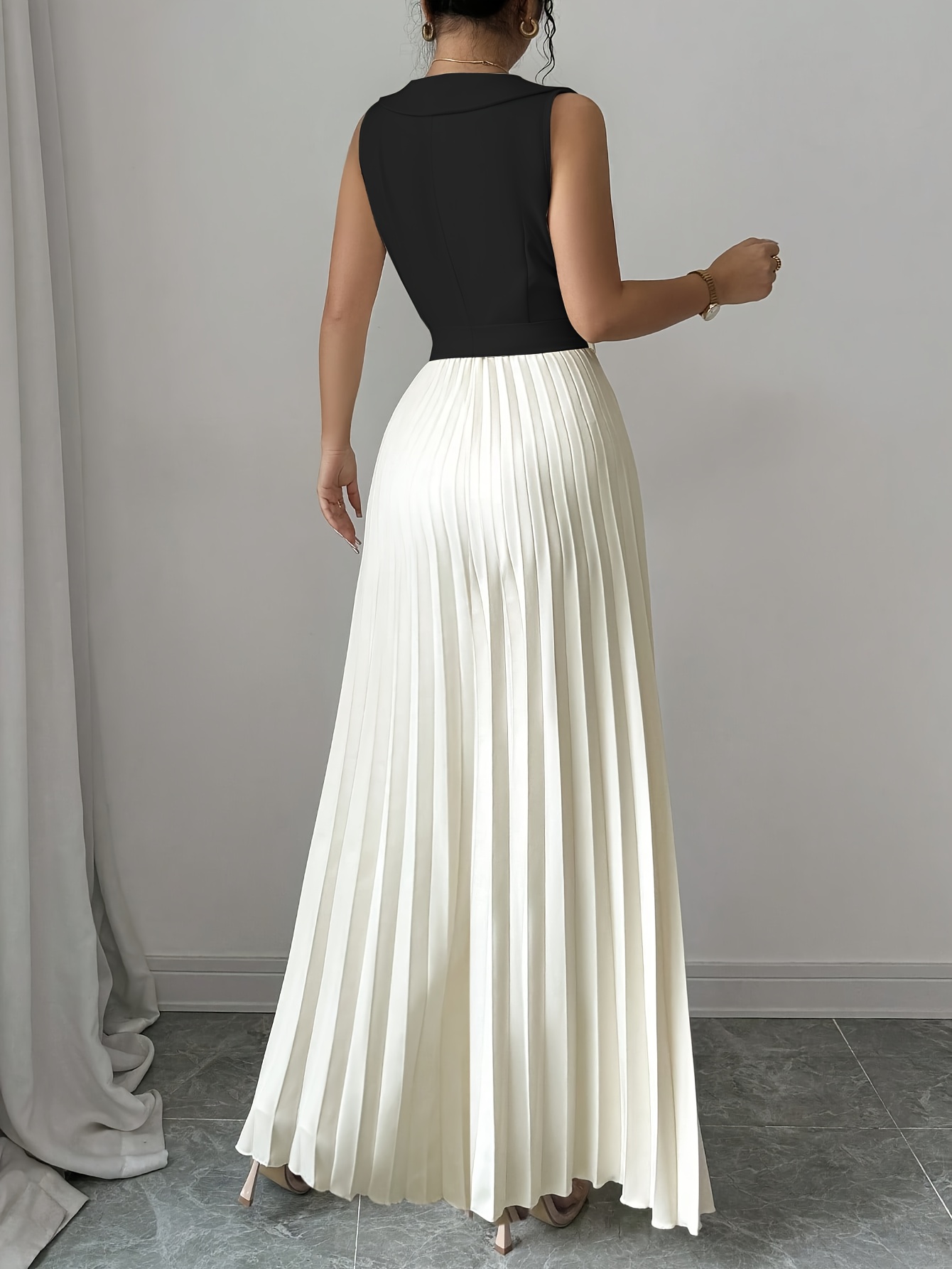Women'S Elegant Double-Breasted Ruched Sleeveless Dress - Black and White Color Block, Polyester, A-Line Silhouette, Perfect for Spring/Summer Commute and Casual Attire, Casual Attire|Ruched Texture|Polyester Dres