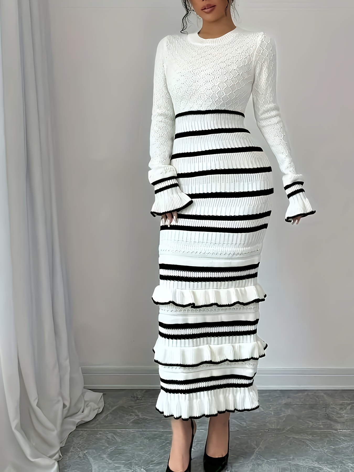 Women's Elegant Striped Dress - Slim Fit Waist-Cinching Bodycon with Ruffled Hem, Black & White Horizontal Stripes, Round Neck Long Sleeve Fall Winter Fashion, Dress