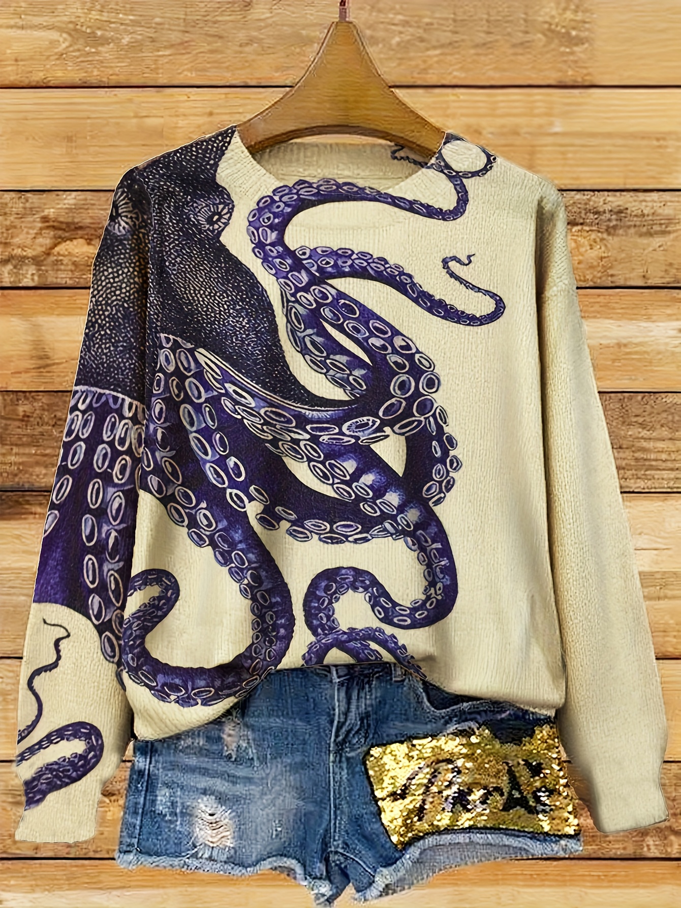 Women's Sweater - Long Sleeve Pullover Sweater with Navy Blue Octopus Tentacle Print, Elegant Casual Chic Sweater for Everyday Formal Outfits, Versatile Clothing, Unique Design, Soft Texture, Printed Top, Trend Followers