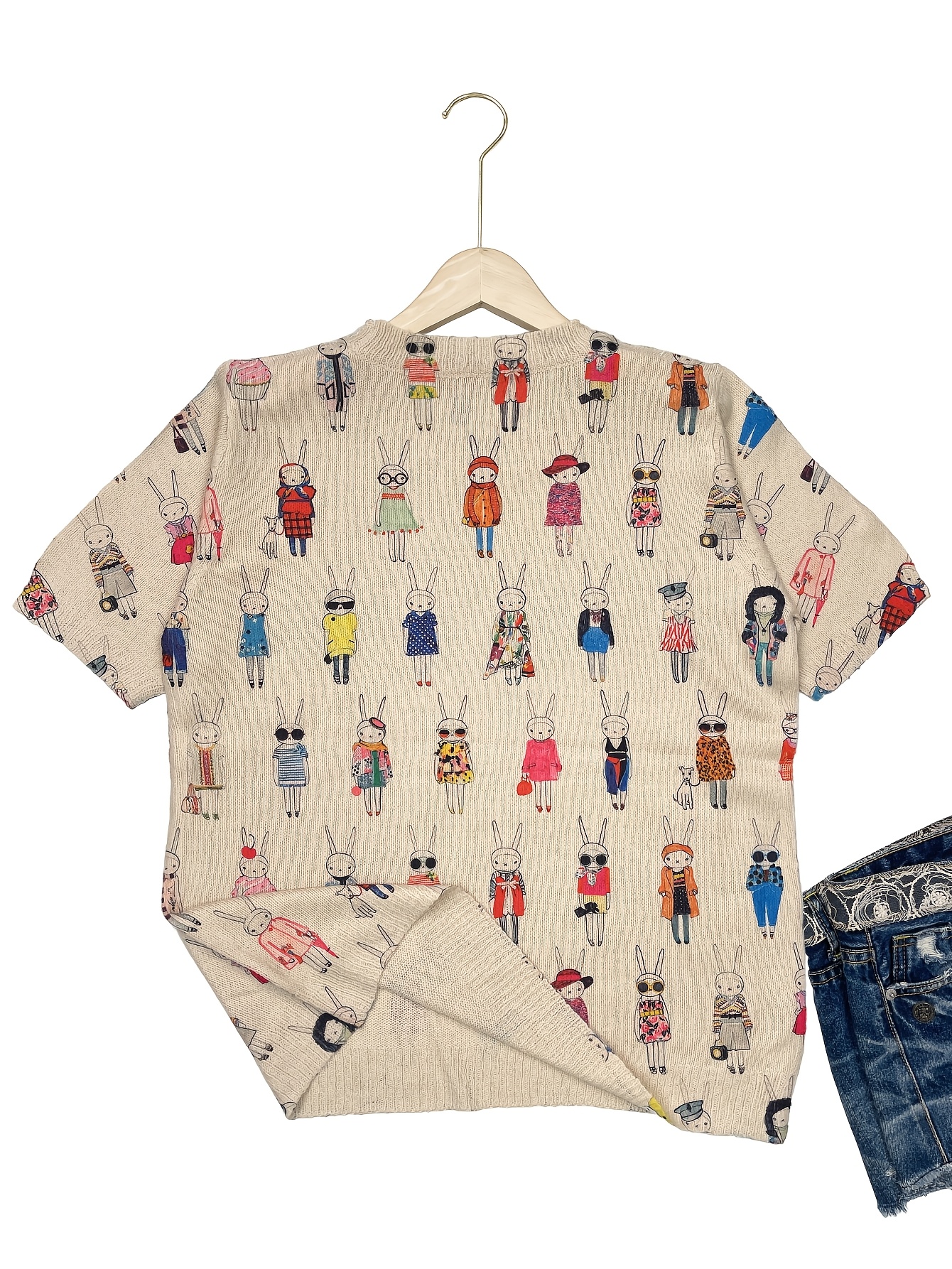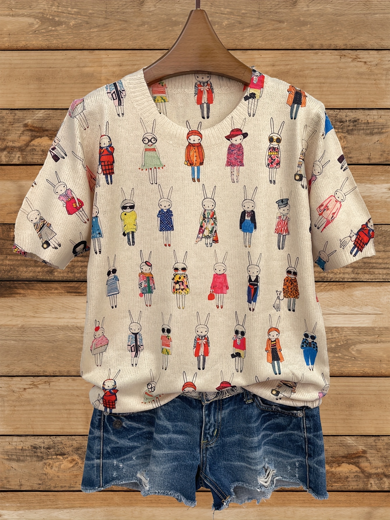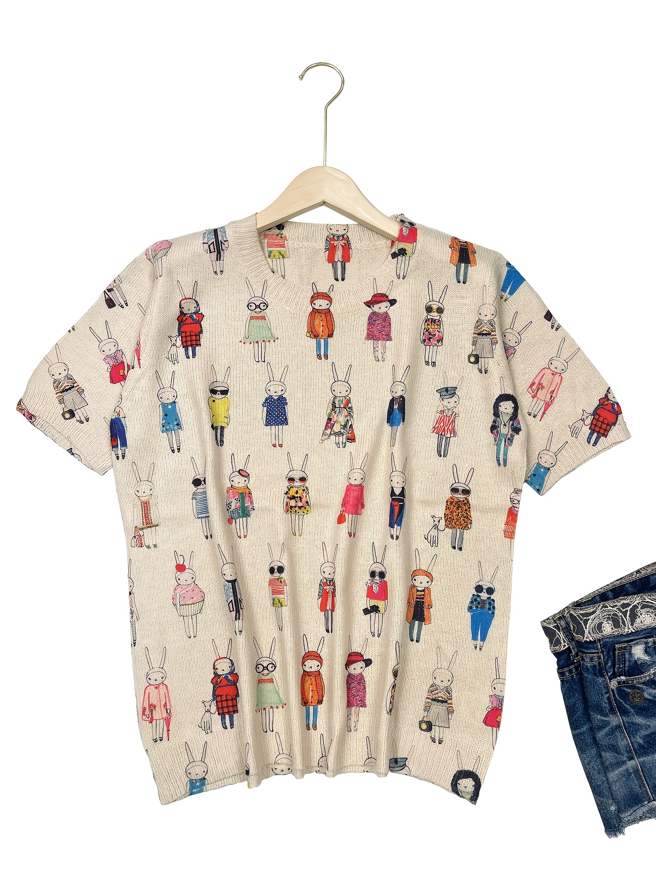 [All-Over Print] [Thin] [Sweater] All-Over Print Rabbit Woman Pattern Thin, Casual Crew Neck Short Sleeve Sweater, Women's Clothing Mother's Day Gift