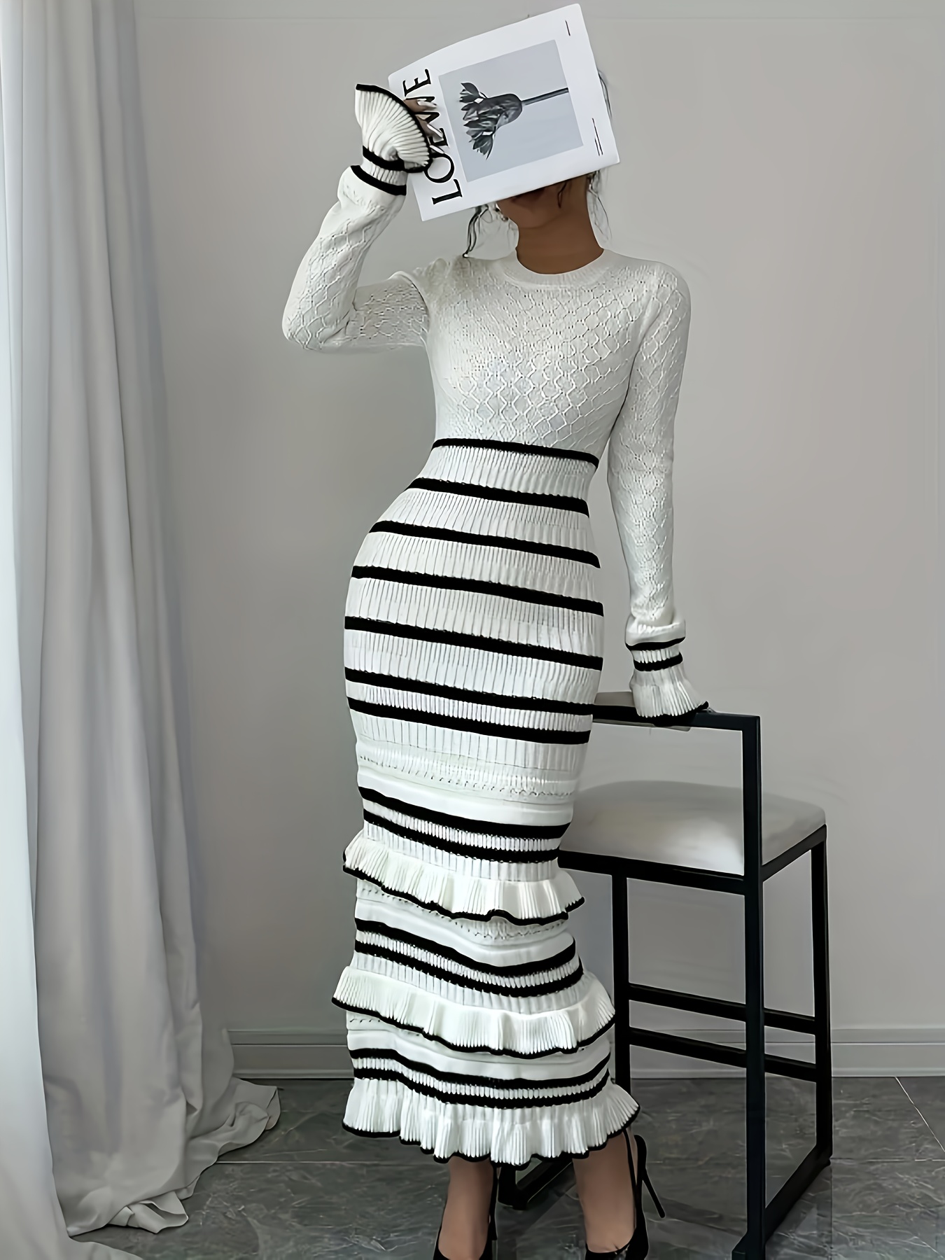 Women's Elegant Striped Dress - Slim Fit Waist-Cinching Bodycon with Ruffled Hem, Black & White Horizontal Stripes, Round Neck Long Sleeve Fall Winter Fashion, Dress