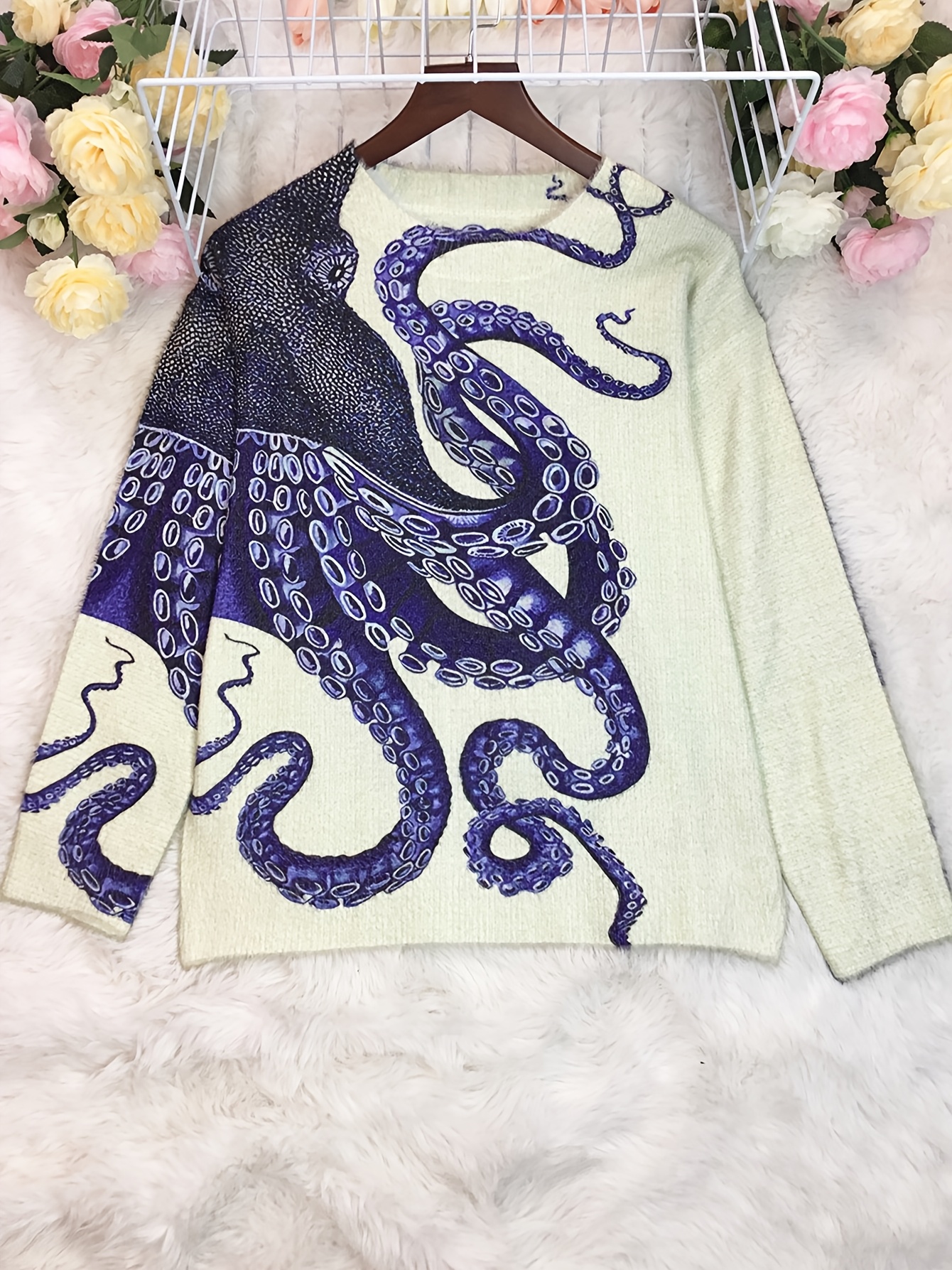 Women's Sweater - Long Sleeve Pullover Sweater with Navy Blue Octopus Tentacle Print, Elegant Casual Chic Sweater for Everyday Formal Outfits, Versatile Clothing, Unique Design, Soft Texture, Printed Top, Trend Followers