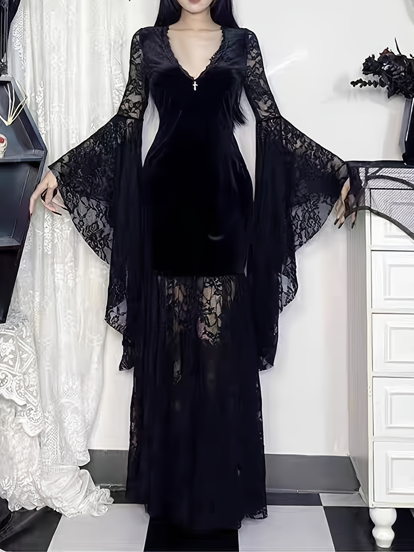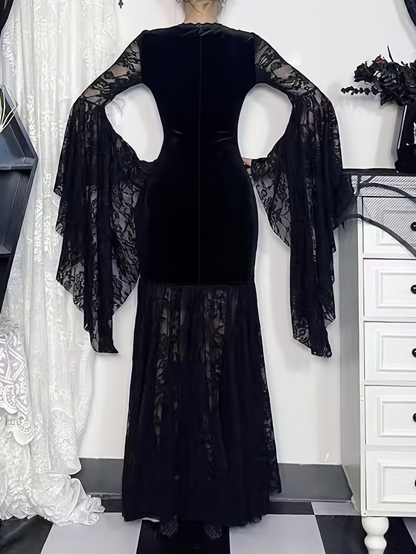 Women's Gothic Dark Halloween Long Dress with Contrast Lace and Velvet Patchwork, Sexy Niche Flared Sleeve Unique Design