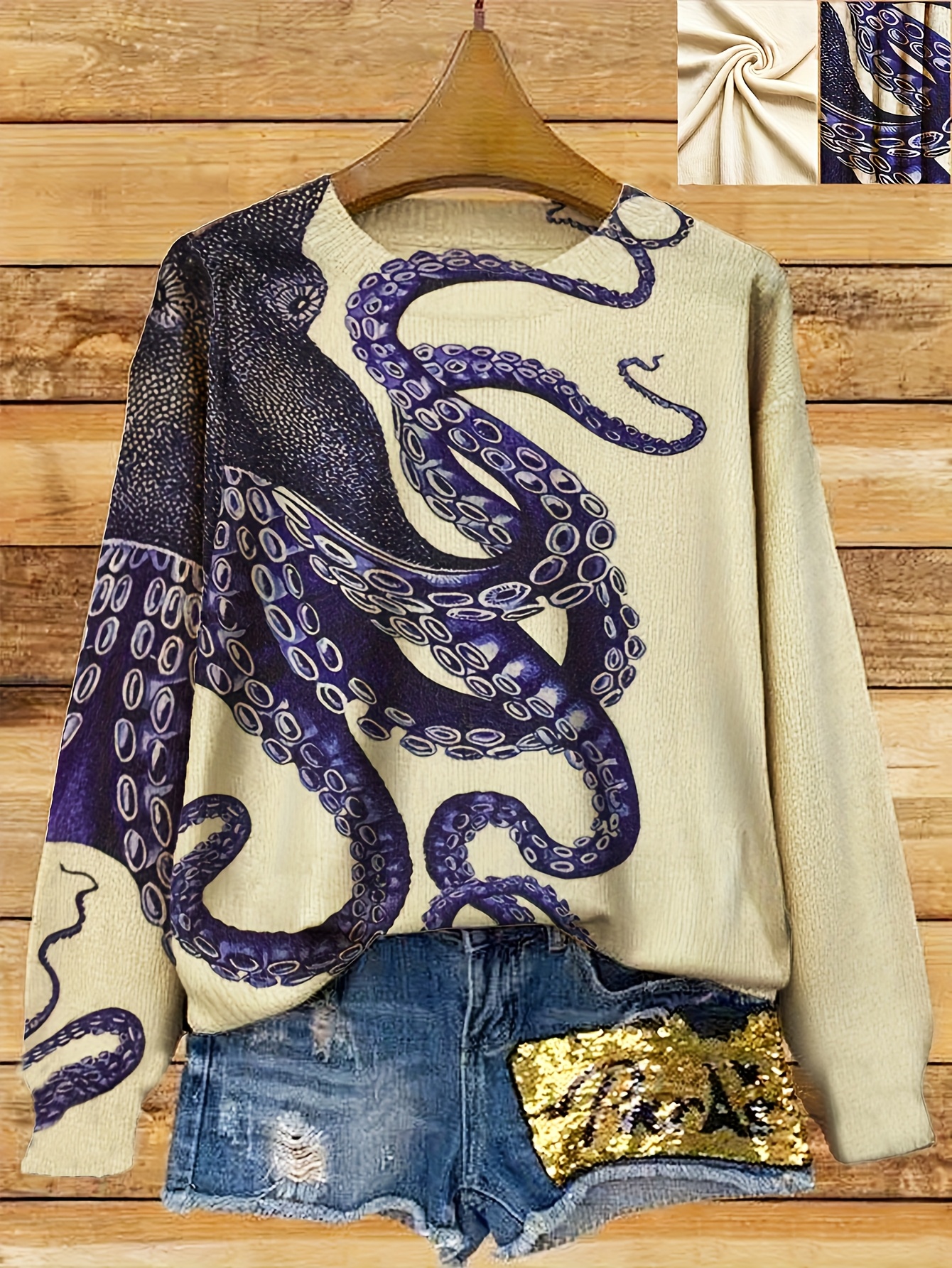 Women's Sweater - Long Sleeve Pullover Sweater with Navy Blue Octopus Tentacle Print, Elegant Casual Chic Sweater for Everyday Formal Outfits, Versatile Clothing, Unique Design, Soft Texture, Printed Top, Trend Followers