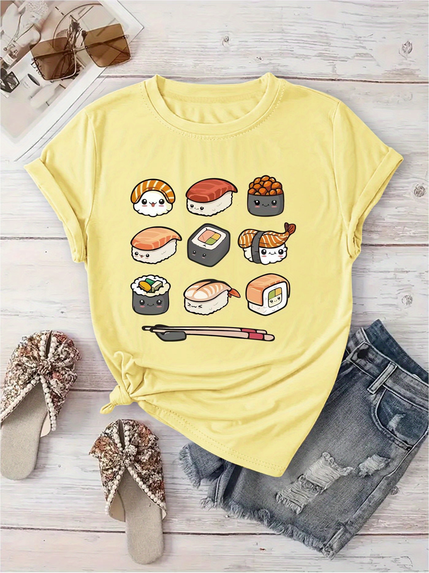 Women'S Casual Sushi Print T-Shirt - Short Sleeve Crew Neck, Vibrant Japanese Food Design, Machine Washable, Perfect for Spring/Summer Outings & Beach Vacations, Beachwear Tshirt | Playful Print Top | Machine Washable Top, Sushi Tshirt