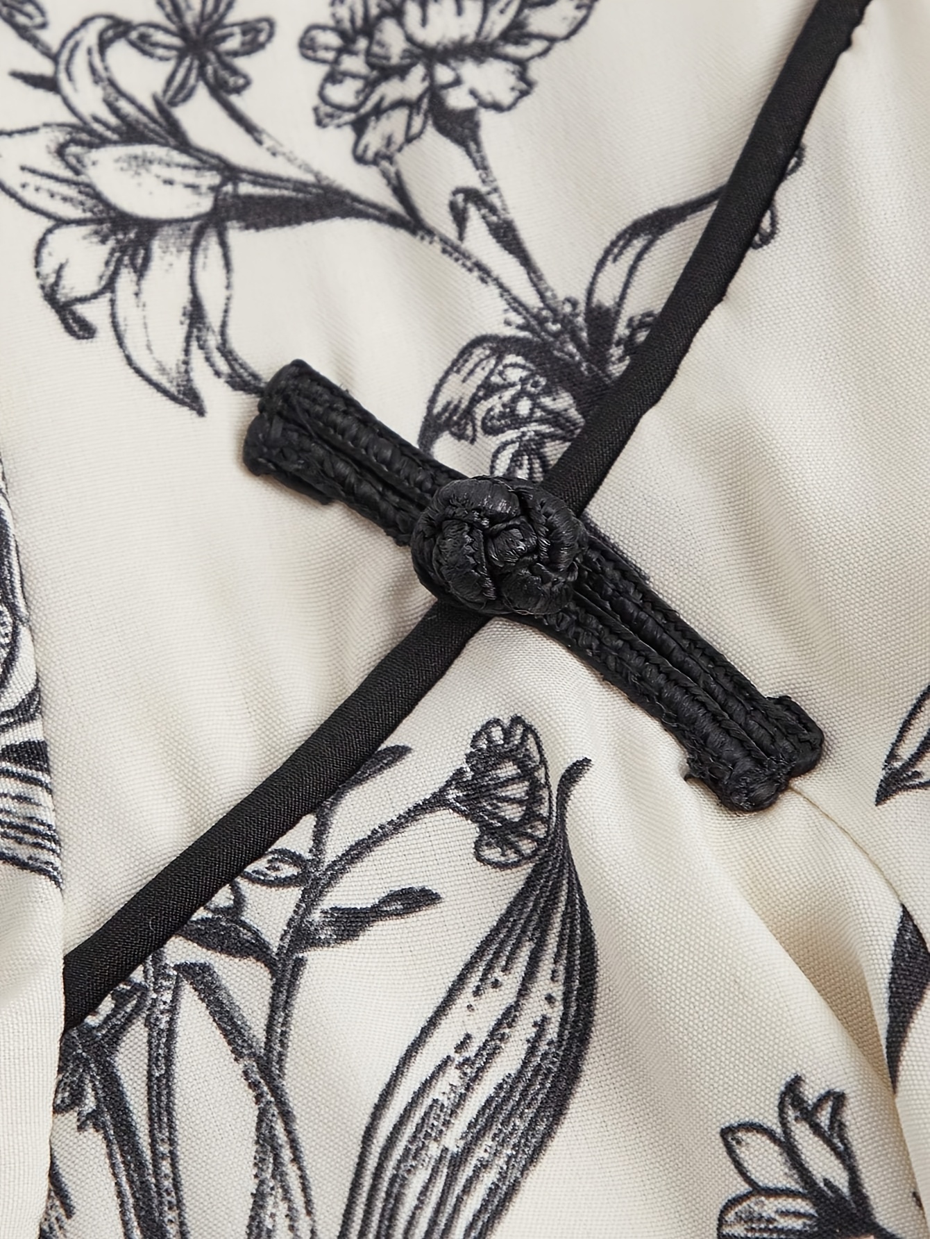 Elegant Black & White Floral Chinese-Style Short Dress with Puffed Sleeves - Waist-Cinching, Stand Collar, Perfect for Spring/Summer, Adult Women'S Fashion, Floral Dress | Stand Collar Dress | Puffed Sleeve Dress
