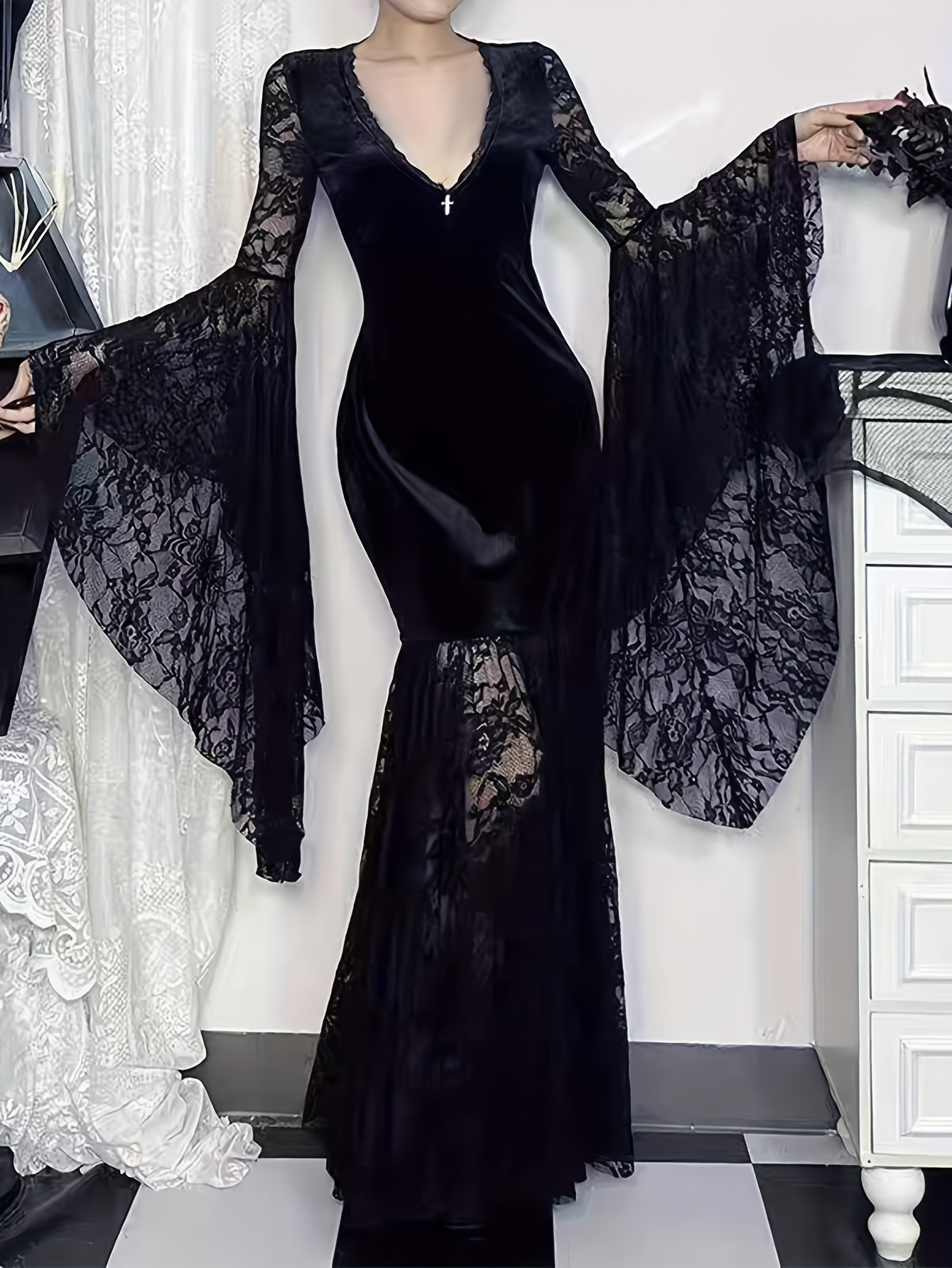 Women's Gothic Dark Halloween Long Dress with Contrast Lace and Velvet Patchwork, Sexy Niche Flared Sleeve Unique Design