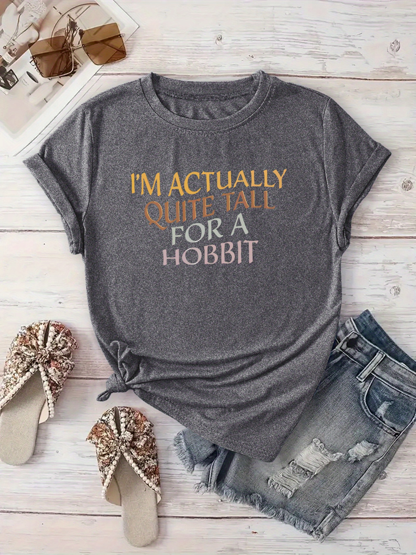 Women's "I'm Actually Quite Tall for A Hobbit" Graphic T-Shirt - Purple Casual Short Sleeve Round Neck Tee, Machine Washable Spring Summer Vacation Top with Golden Lettering, Regular Fit, Casual Attire, Playful Design, Durable Fabric