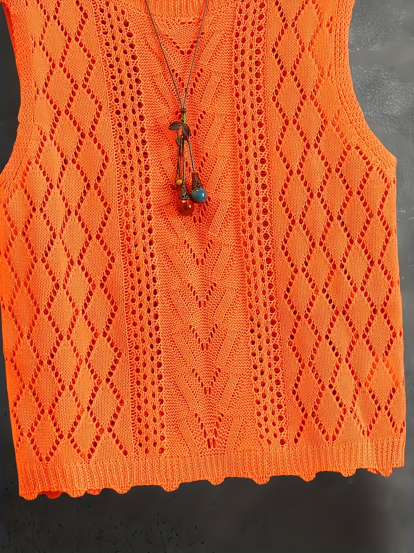 Women's Sleeveless Geometric Cut-Out Vest - Bright Orange Elegant Casual H-Line Regular Fit, All-Season Versatile Layering Piece for Casual Attire, Openwork Pattern, Lightweight Fashion, Summer Wardrobe, Delicate Detailing, Stylish Women